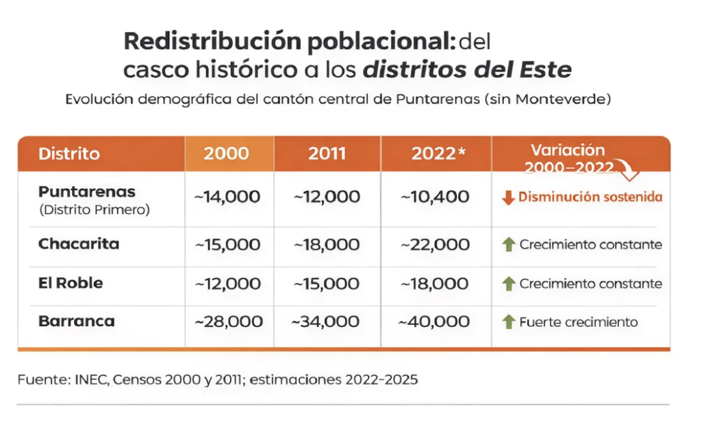 Los datos demográficos muestran una realidad más compleja que el discurso de “ciudad fantasma”. El cantón central de Puntarenas ha crecido en las últimas dos décadas; sin embargo, ese crecimiento no ocurrió en el casco histórico. Mientras el distrito Primero pasó de rondar los 14.000 habitantes en el año 2000 a poco más de 10.000 en las estimaciones recientes, Barranca, El Roble y Chacarita aumentaron de manera sostenida su población.